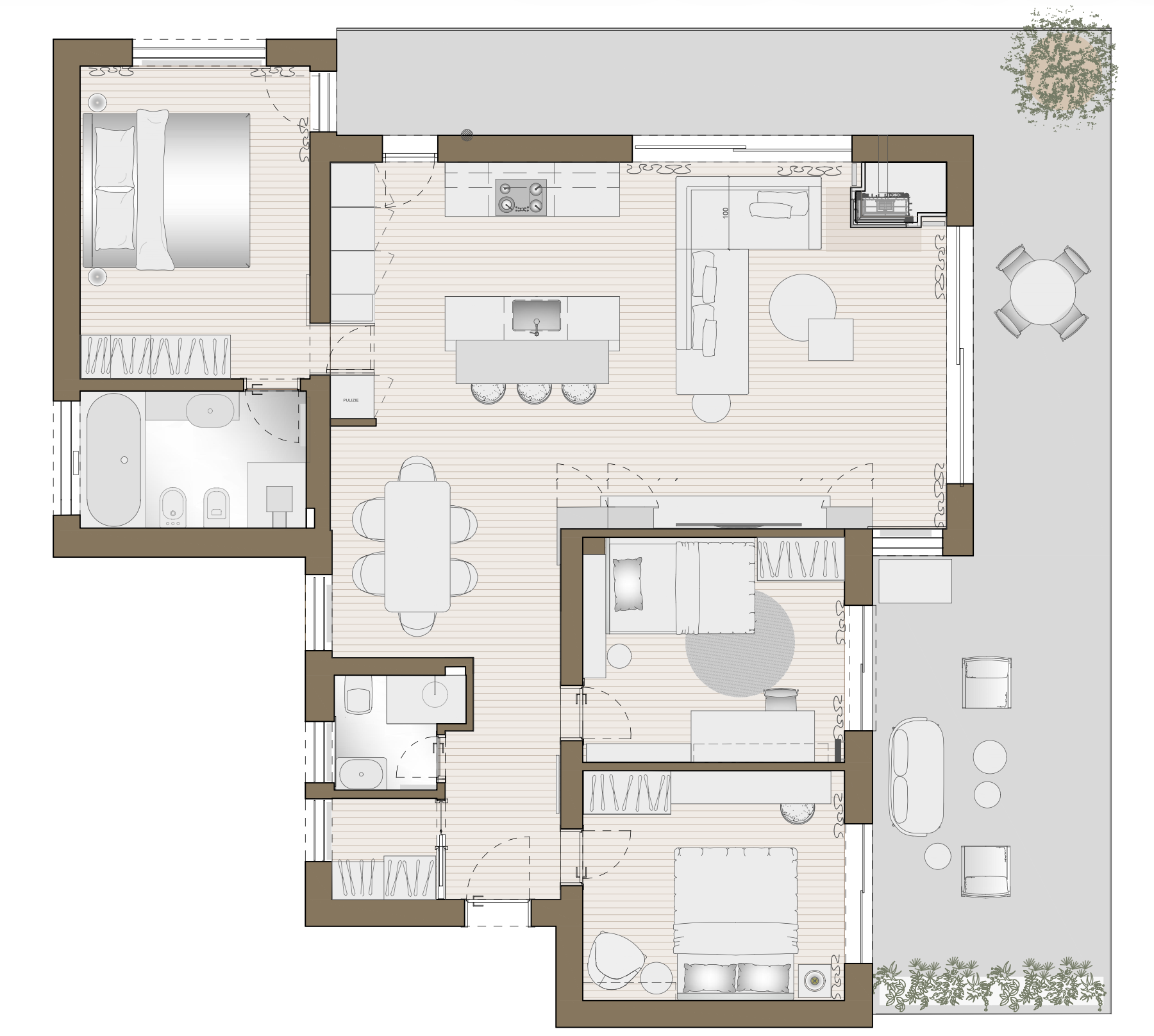 The entire project is permeated by careful and consistent color research. The neutral shades, balanced across the walls, fabrics, and furnishings, define a sophisticated and contemporary palette, capable of reflecting the taste and lifestyle of a young and evolving family.
